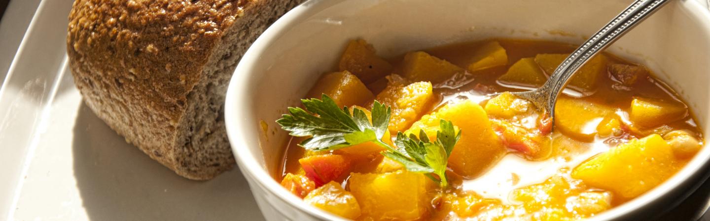 This soup, from Omega’s executive chef Robert Turner, is a great fall and winter dish and is good for a dinner party or lunches during the week. Be careful peeling and cutting up the squash—a sharp vegetable peeler and a sharp, strong knife or cleaver will help. If you don’t have the time or inclination to cut up your own squash, many stores offer pre-cut squash in the produce department. Canned beans are also a shortcut for this recipe.
