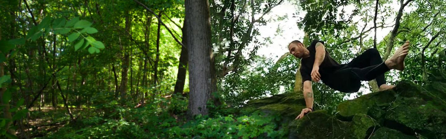 Lang: The container here is very open, multi-disciplinary, and nested within a beautiful forest landscape. I practice MovNat every day. I do the movement dance classes with other people here. That, for me, is movement research. I have been doing impromptu Animal Flow classes with people here and exploring movement with other like-minded people. I love playing with games, AcroYoga, solving movement riddles, going out into the woods: vaulting, jumping, climbing.
