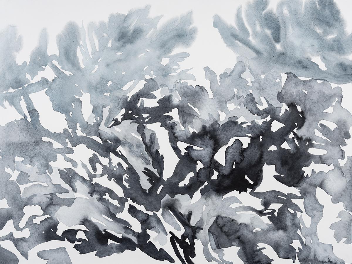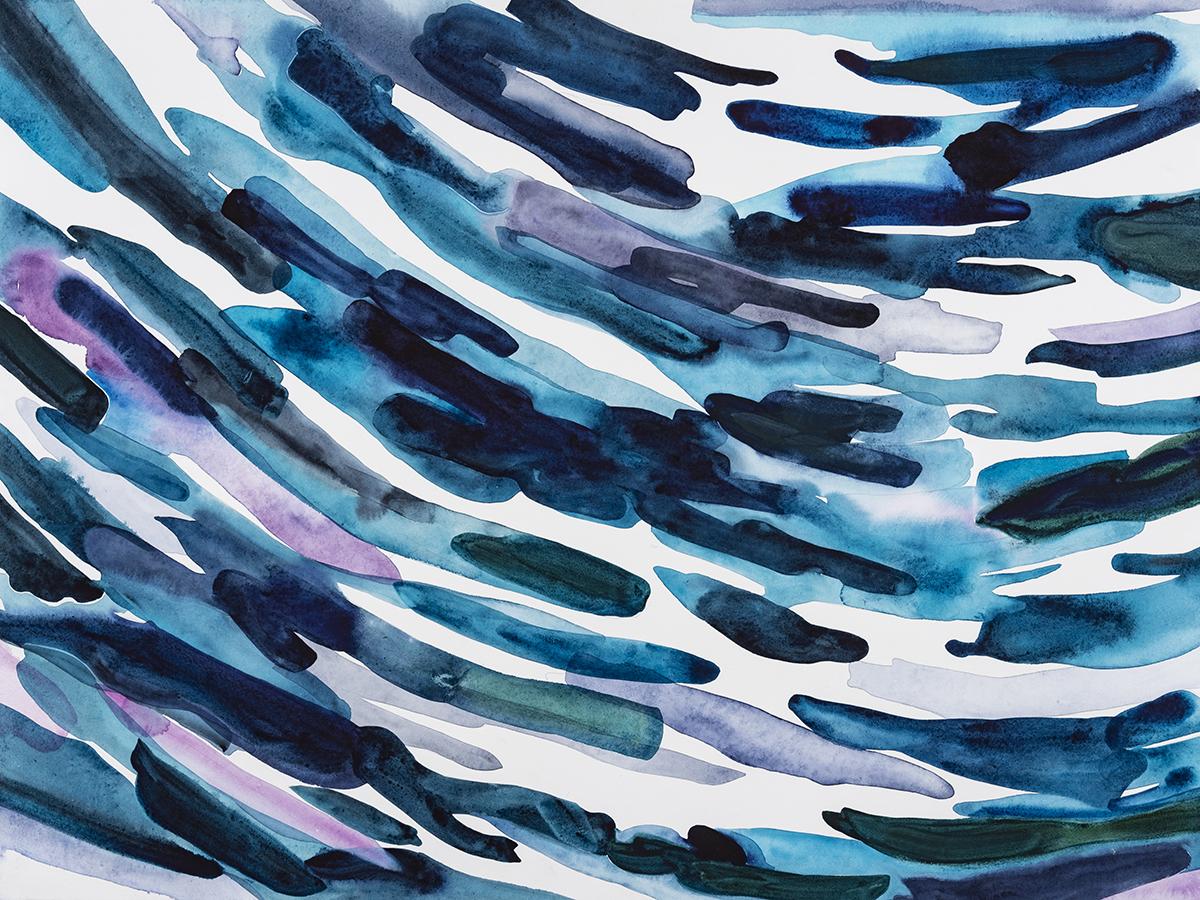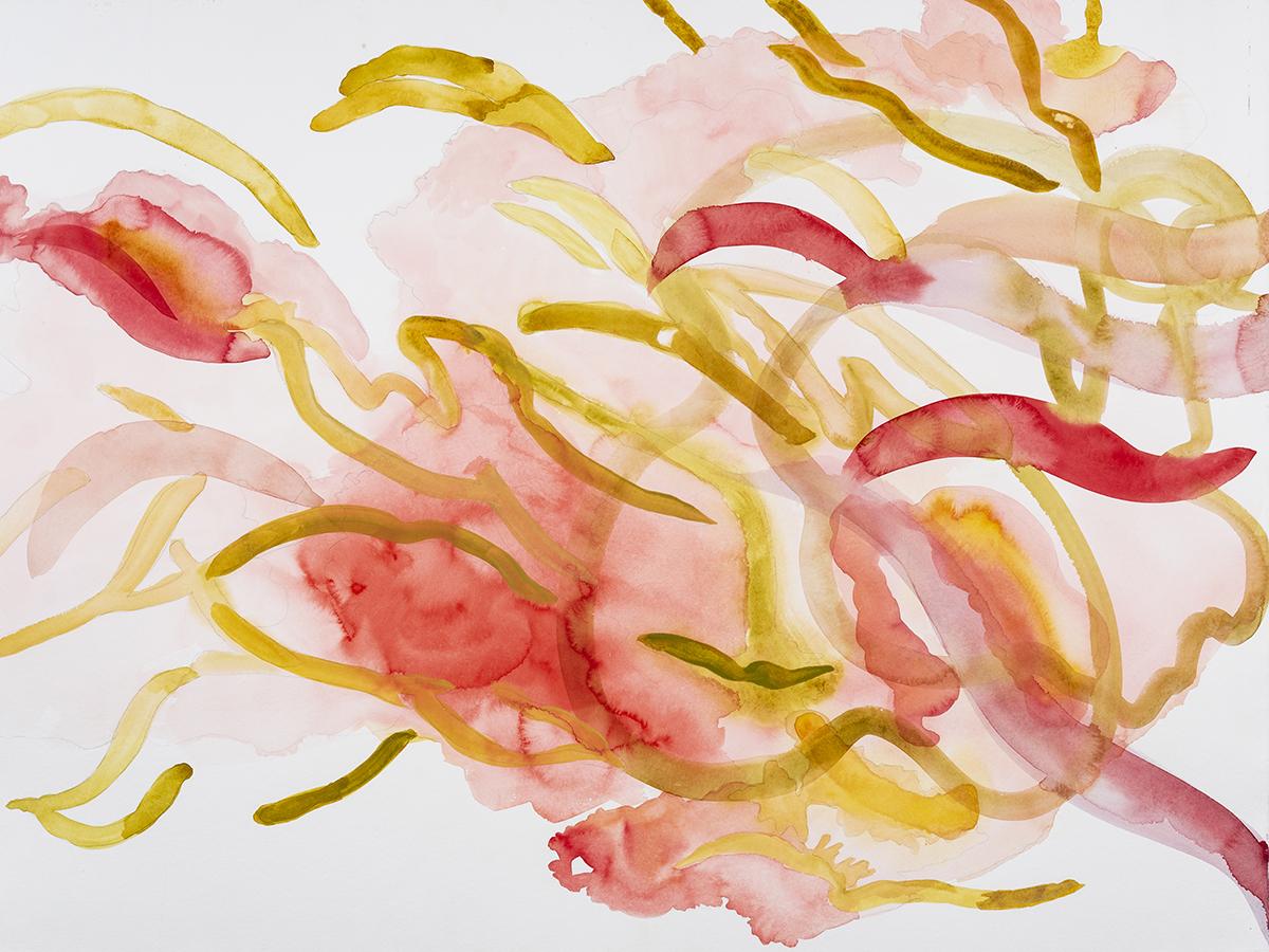 Her medium is watercolor. Translucent and spontaneous, watercolor carries with it a sense of innate freedom. In describing the medium, Garside states “Watercolor has a mind of its own, creating incidents as it pools and dries that are more graceful than I could consciously draw. It’s a unique force, affected by wind, gravity, and temperature.”
