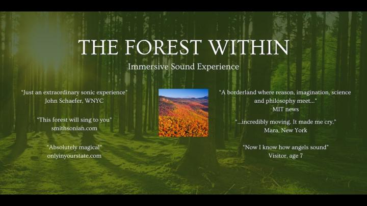 The Forest Within features 72 voice choirs, including four-time Grammy winner The Crossing, singing in the Mohawk tongue. Wyer's installations have attracted more than 500,000 visitors at venues such as the New York Botanical Garden—but this version is uniquely curated for Omega Institute.